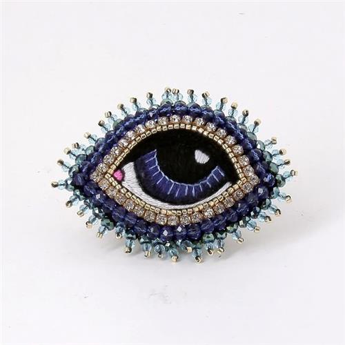 The Céleste Eye Brooch has become the classic of the Céleste Mogador brand. The eye is delicately hand-embroidered with colourful silk threads. Japanese Miyuki gold beads adorn the eye contour. Three rows of pearls in shades of blue complete the details of this signature jewel.